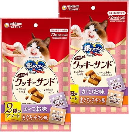 【まとめ買い】銀のスプーン 猫用 おやつ お魚味クッキーサンド 2種のアソート かつお・まぐろチキン味 72g×2 国産 キャットフード ユニチャーム
