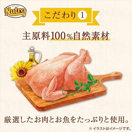 高品質な自然素材(チキン・ビーフ・ツナ・サーモン・白身魚・キャノーラ油)に含まれる亜鉛やリノール酸が、皮膚・被毛の健康維持をサポートします。