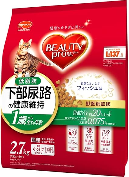 ビューティープロ キャットフード 下部尿路の健康維持 低脂肪 1歳から フィッシュ味 2.7kg 【国産】 【獣医師監修】 【小分包装】