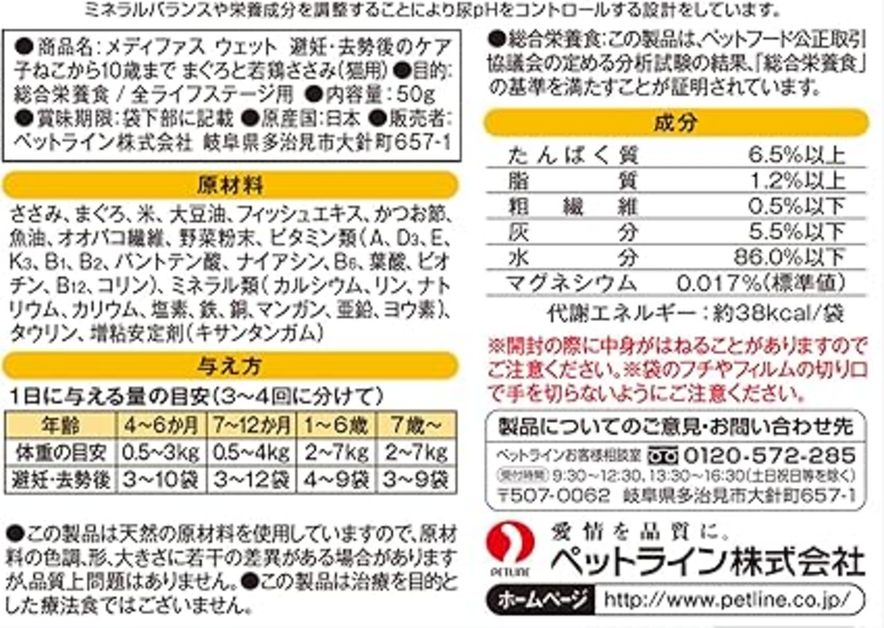 メディファス ウェット キャットフード 避妊・去勢後のケア 子ねこから10歳まで まぐろと若鶏ささみ 【総合栄養食/下部尿路/pHコントロール/国産】 50gx12 (まとめ買い)
