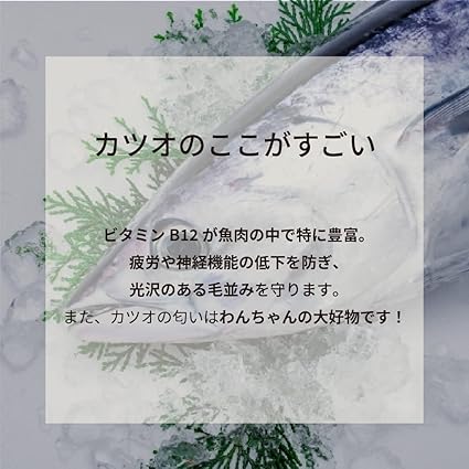 カツオはビタミンB12が魚肉の中で特に豊富。披露や神経機能の低下を防ぎ、光沢のある毛並みを守ります。また、カツオの匂いはわんちゃんの大好物です。