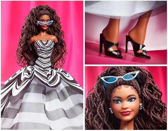 【内容】バービーの65周年を記念したゴージャスなバービー!ブルネットのヘアにブルーのサングラスが印象的で、バービーを象徴する伝統的なアイテムにインスパイアされたドレスを着用しています。シューズタイプ(靴x足):ヒールxヒール