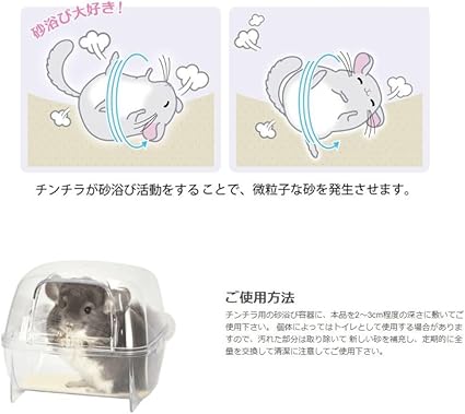【 チンチラの砂浴びの重要性 】チンチラはハウス内で砂浴びをすることで、チンチラの皮脂線から出る余分な分泌物を落とし、毛玉や病気予防をしています。砂浴びをしないとカビなどが発生し、病気の原因となります