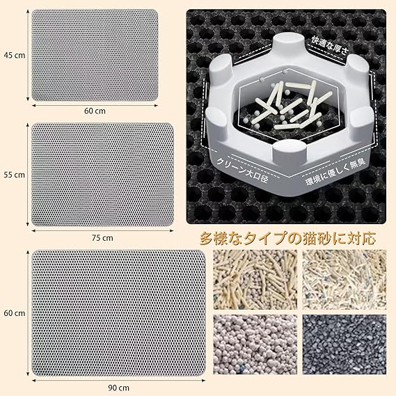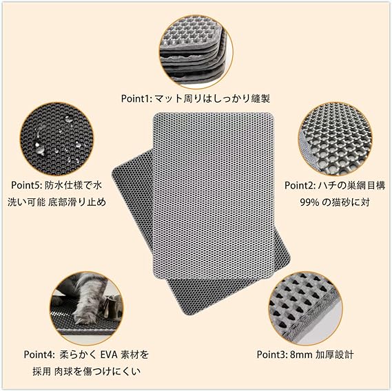 【安全無毒無味&防水防臭】猫砂マットは耐久性が高いEVA素材を使用しており、猫が爪研ぎでも壊れない耐久性があり、長く使え続けます。上層独立気泡構造を採用して、湿気に強くて、カビの発生や匂いの発散をしっかりと抑制できます。下の層は完全防水でおしっこを床に流れるのを防ぎ、水洗い後すぐ乾かせます。