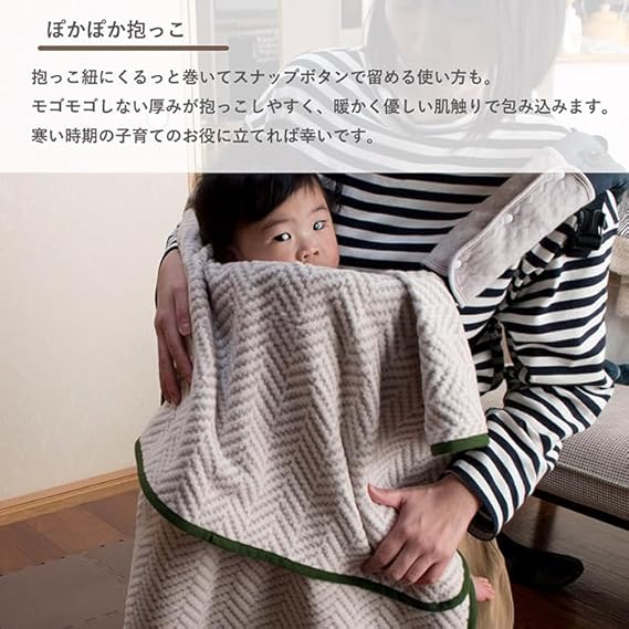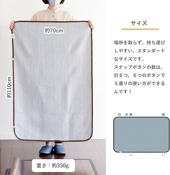 【5パターンの使い道!】ブランケット、ポンチョ、巻きスカート、スリーピングバッグ、簡易授乳ケープなど、スナップボタンの留め方で5パターンに使い分けることができます。