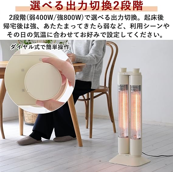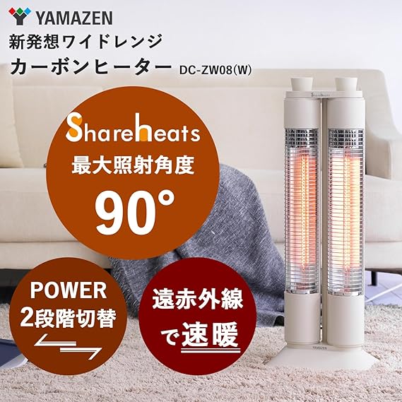 [山善] カーボンヒーター 遠赤外線 ワイドレンジ ヒーター 2本管 左右角度調節 速暖 出力切替2段階 転倒オフスイッチ ホワイト DC-ZW08(W)