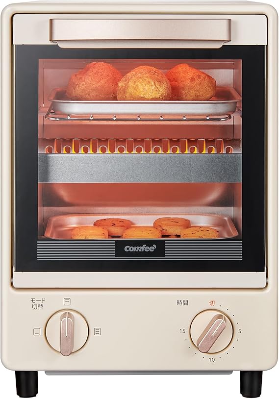 COMFEE' オープントースター 縦型 8L トースト2枚焼き 上下2段構造 3本ヒーター搭載 1000W高火力 15分タイマー 焼きムラ抑え スライドオープンドア パンくずトレイ1枚・受け皿2枚付き つまみ操作 トースター 縦型オーブントースター スリム レトロ 新年 新生活 CF-MF082-AY 杏色 2024年新型