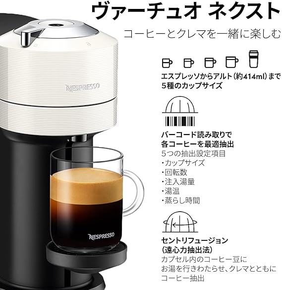 ネスプレッソ カプセル式コーヒーメーカー ヴァーチュオ ネクスト ホワイト 水タンク容量1.1L 遠心力抽出 ワンタッチ GDV1-WH-W