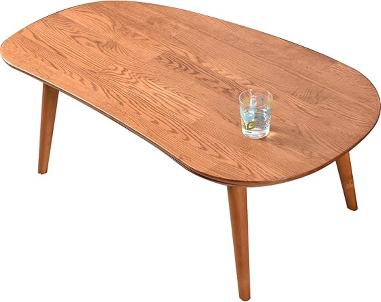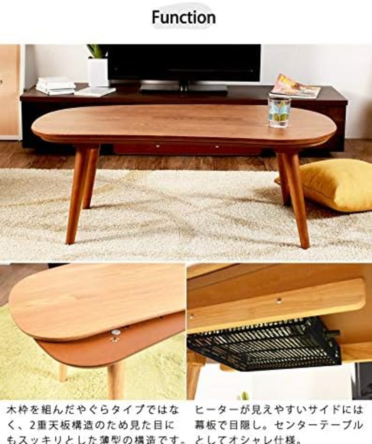 天板はおしゃれな丸みのある形状。オーク突き板仕様。年中通してリビングテーブルとしてご利用いただけます。