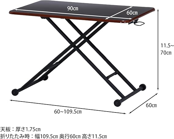サイズ:幅90×奥行60×高さ11.5~70cm 折りたたみサイズ:幅109.5×奥行60×厚み11.5cm 天板サイズ:90x60x1.8cm