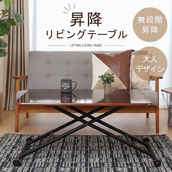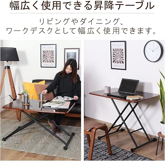 不二貿易 昇降式テーブル センターテーブル 幅90~109.5×奥行60×高さ11.5~70cm ブラウン ガス圧 無段階調整 キャスター付き 完成品 74710