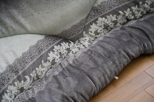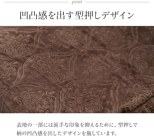 【商品紹介】控えめなエレガンス柄を取り入れたのこたつ布団。表地には派手な印象を抑えるために、型押しで柄の凹凸感を出したデザインを施しています。ふっくらとしたボリューム感は国内で綿入加工をしている商品だからできる仕上がりです。表地と裏地にあったか素材のフランネルを使用しています。