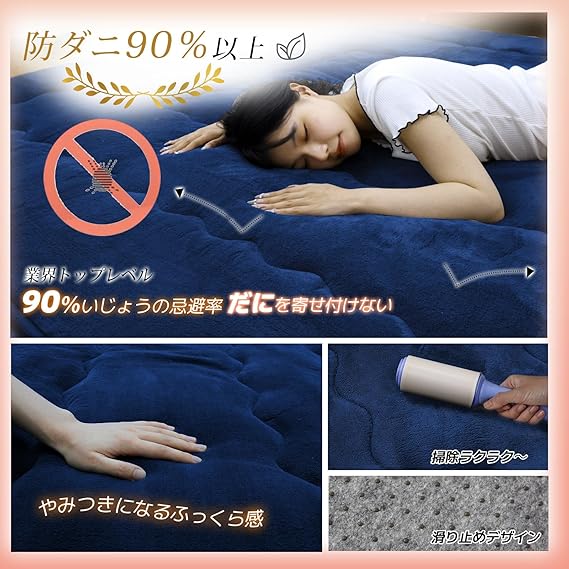 【4cm厚さ・こだわり6層構造】①表地「接触温感Q-MAX0.08」8mm ロングパイルフランネル②「熱を蓄え・保温」蓄熱わた③「暖かい空気をたくさん含む」固わた ④「熱をしっかりロック」ポリエチレンシート ⑤「冷気遮断 反射断熱」アルミシート ⑥「ズレにくい」滑り止め不織布。ふっくらでしっかり!