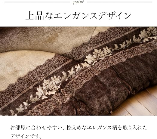 【商品紹介】控えめなエレガンス柄を取り入れたのこたつ布団。表地には派手な印象を抑えるために、型押しで柄の凹凸感を出したデザインを施しています。ふっくらとしたボリューム感は国内で綿入加工をしている商品だからできる仕上がりです。表地と裏地にあったか素材のフランネルを使用しています。