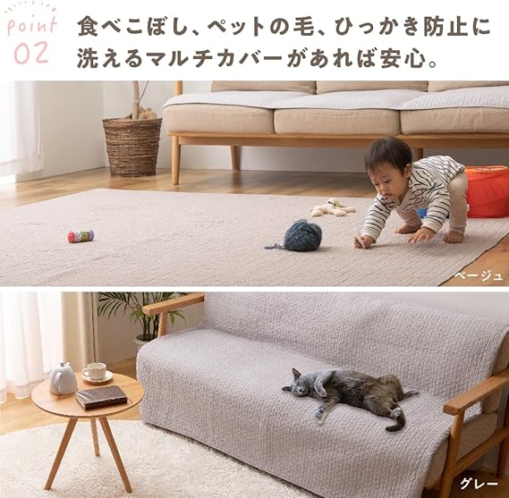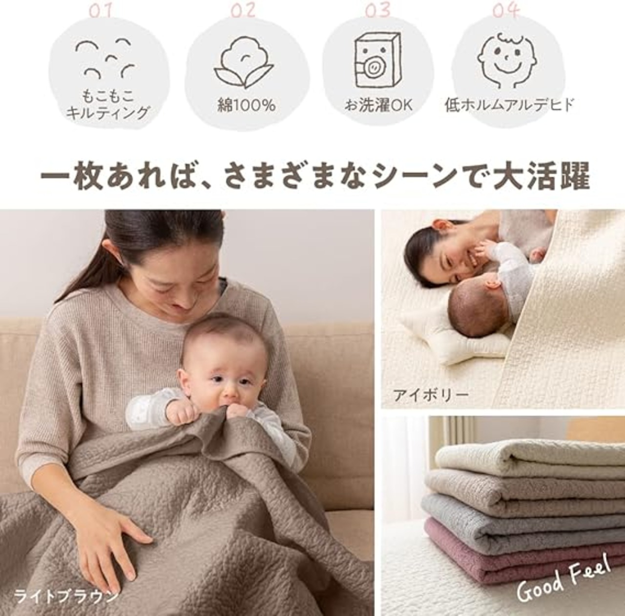 【特長】お肌にやさしく、吸水・吸湿力に優れた綿100%のマルチカバー。厚生労働省の定める乳幼児基準をクリアした低ホルムアルデヒド製品で、安心品質です。