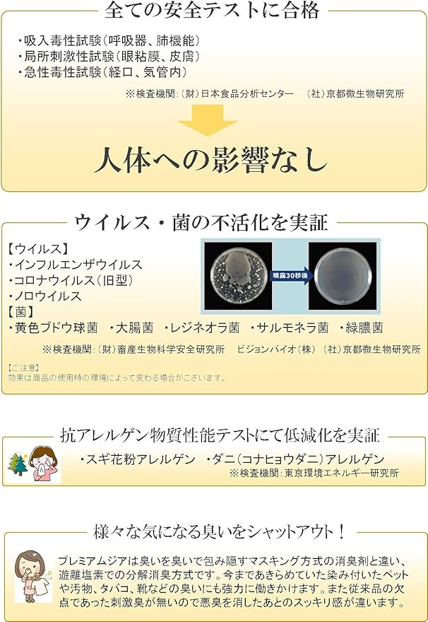 【専門機関で安心性を実証済み】非刺激性(弱アルカリ性)および食品添加物由来成分なので、安心してお使いいただけます。専門の試験機関による眼刺激性試験、急性経口毒性試験、皮膚刺激性試験、気管内急性毒性試験等の安全性試験も実施済みです。