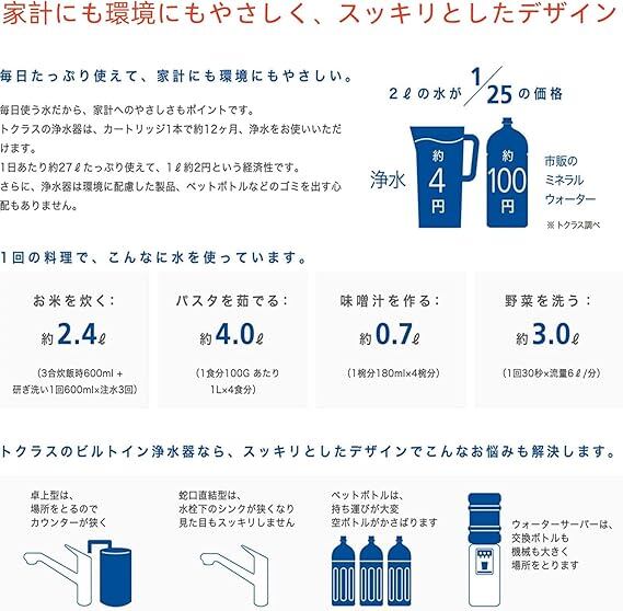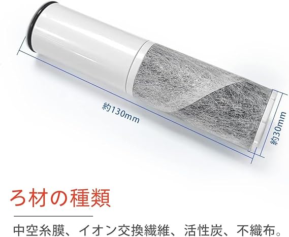 【 吸着性が強い 】濾過材料は活性炭、不織布、中空繊維膜(原材料アルミン酸カルシウム)を採用し、水道水中の不純物を吸着することができる。廃棄時の環境への負担が少ない、フィルターコア1本当たりの水流量1200 L最高除去率80%、5種類の物質を除去可能