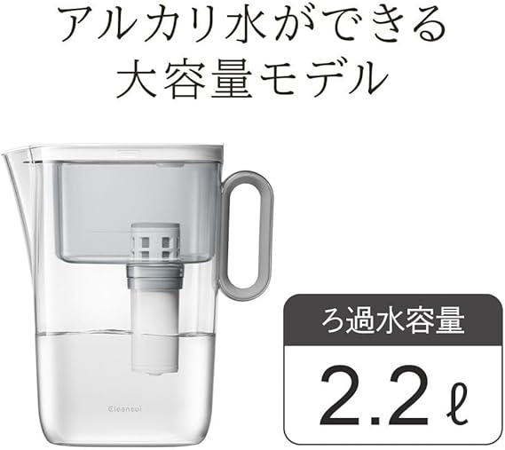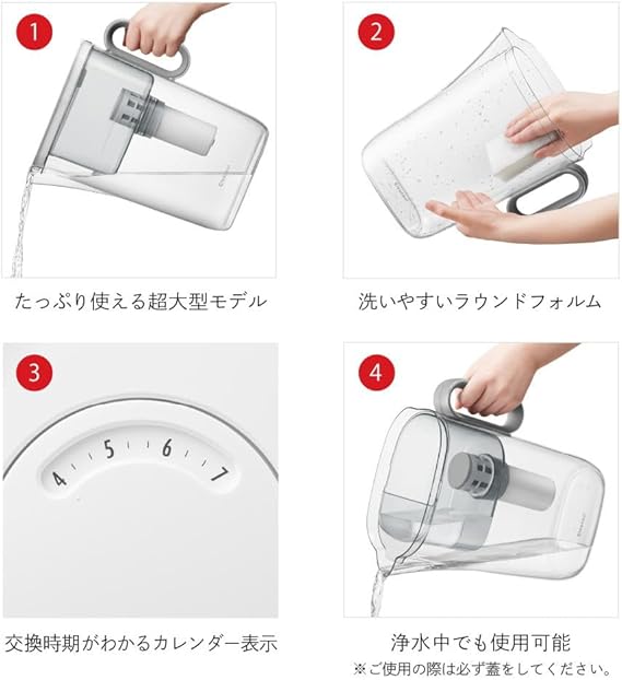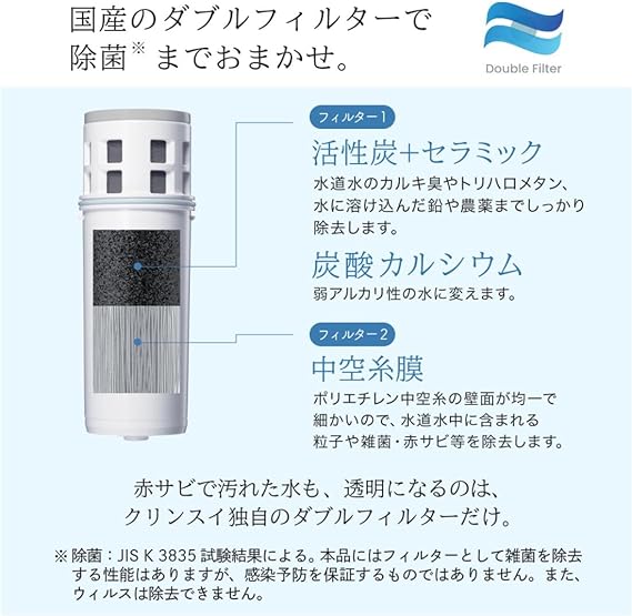 業界唯一のダブルフィルター搭載。交換時期の目安:3ヶ月(1日2L使用の場合)、ろ過水容量:2.2L(全容量:3.6L)