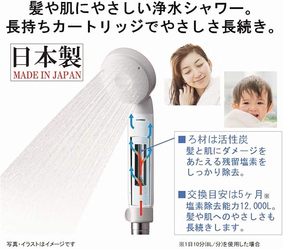 30%の節水機能※1、長寿命カートリッジ※2、日本アトピー協会推薦品、浄水/原水をカンタン切替え、簡単取り付け、医師が勧めたい浄水シャワー、※については商品の説明(ページ下部)に記載