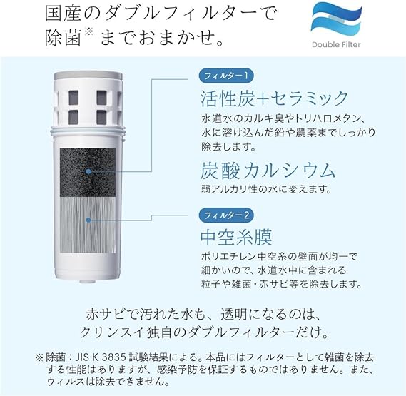 業界唯一のダブルフィルター搭載。交換時期の目安:3ヶ月(1日2L使用の場合)、ろ過水容量:1.1L(全容量:1.7L)