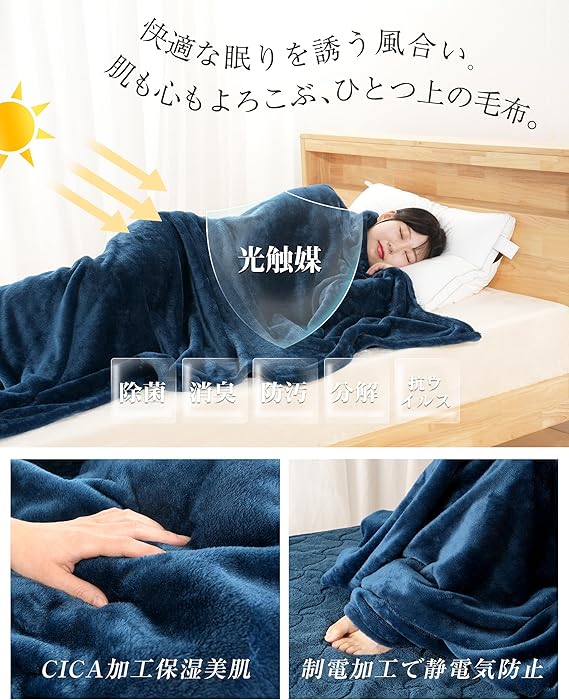 IMA HOME 【通常長さ+40cm】 ニューマイヤー 毛布 シングル 冬 あったか ブランケット 吸湿発熱 ふわふわ なめらか 掛け毛布 静電気対策強化 W抗菌防臭 すっぽり ゆったり 足がはみ出ない 軽量 洗える(140×230cm ネイビー)