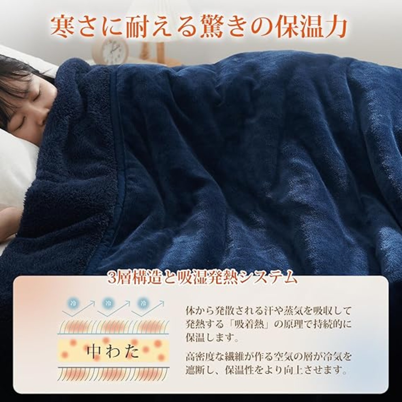 「優れた保温性」吸湿発熱による優れた保温性で、体から発散する汗や水分を吸収し、ムレや不快感を軽減します。寒い夜もぽかぽかと暖か