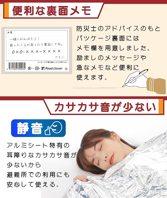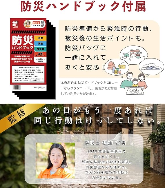 このマルチアルミシート(サバイバルシート)は、現役防災士の監修により開発されました。防災ハンドブックが付属しており、災害対策から被災後の生活支援に至るまで、防災グッズとしても広範な知識が提供されています。また、専用の収納袋が付属し、さらにパッケージにメモ領域が設けられているなど、防災士による経験豊かな智恵が活かされています。
