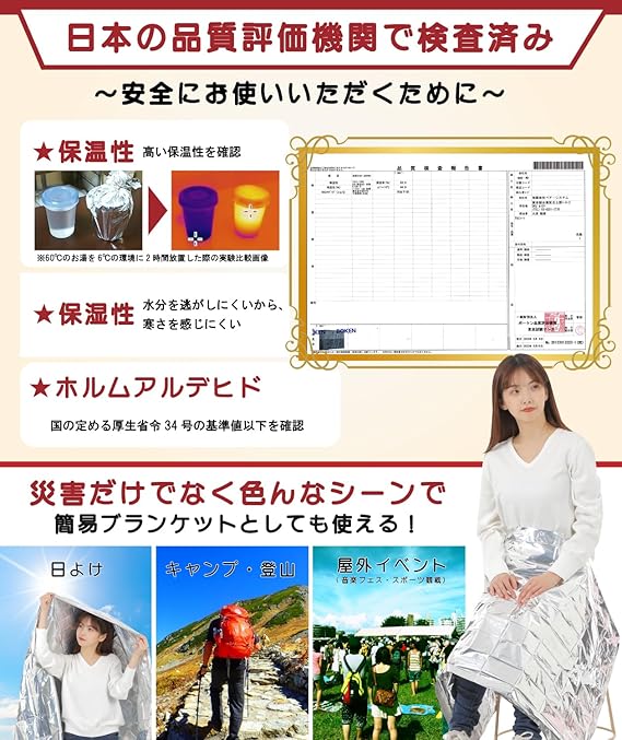このアルミシート(サバイバルシート)は、エマージェンシーシートとも言い、急な気温変化や緊急災害の緊急時に災害グッズとして体を保護し、冷え込みから身を守ることができます。広げ