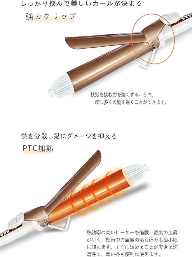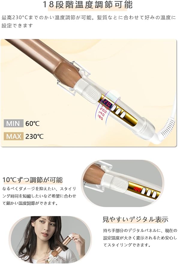 ■みずみずしく弾む目を奪うほど美しいカール§:最高温度230℃のプロ仕様で、60℃〜230℃まで、10℃ごとに18段階で温度調整が可能です。髪質やヘアスタイルに応じて切り替えられるのが便利です。VAPAKAのカールアイロンは、髪をやさしく包み、均一に熱を伝えることでみずみずしく弾む立体的なカールを生み出します。毎朝のスタイリングはもちろん、大事なイベントの日、雨で湿気の多い日、デート、パーティ・・・髪をバッチリ決めたいシーンにしっかりとスタイルが決まる。