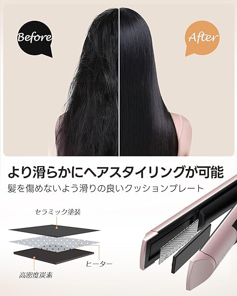 【進化された新バージョン】KN-2606コードレスヘアアイロンの新バージョンが、皆様からのご意見を参考に新しく進化しました。三つのポイントが向上しています。① 本体とアダプターの互換性を向上させ、市販の普通のアダプターでも利用可能です。② レートの側面を滑らかに改善し、より自然なカールスタイリングが楽しめます。③ 外観もアップグレードし、より洗練されたデザインになりました。