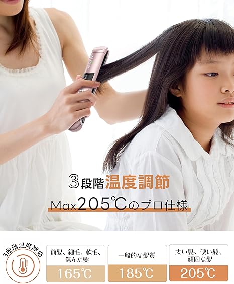 【Max205℃ & 急速立ち上げ】最高温度はプロ仕様の205℃で、キープ力を向上させます。また、3段階の温度調節(165