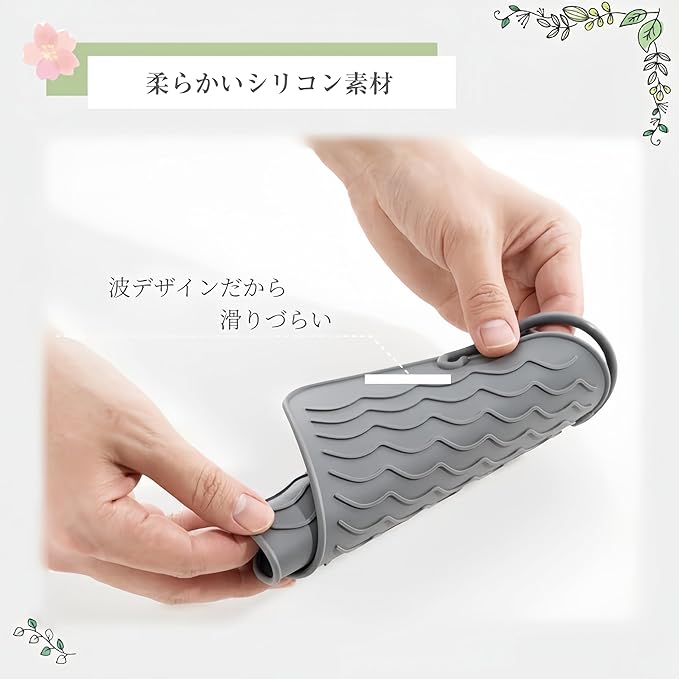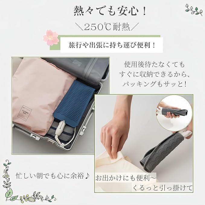 【高品質な耐熱素材】このヘアアイロンマット&ポーチは耐熱温度250℃の耐熱シリコンを採用しているため、熱くなったヘアアイロンを使用後にヘアアイロンカバーで包めば、熱いままでサッとヘアアイロンを引き出しにしまうことができます。