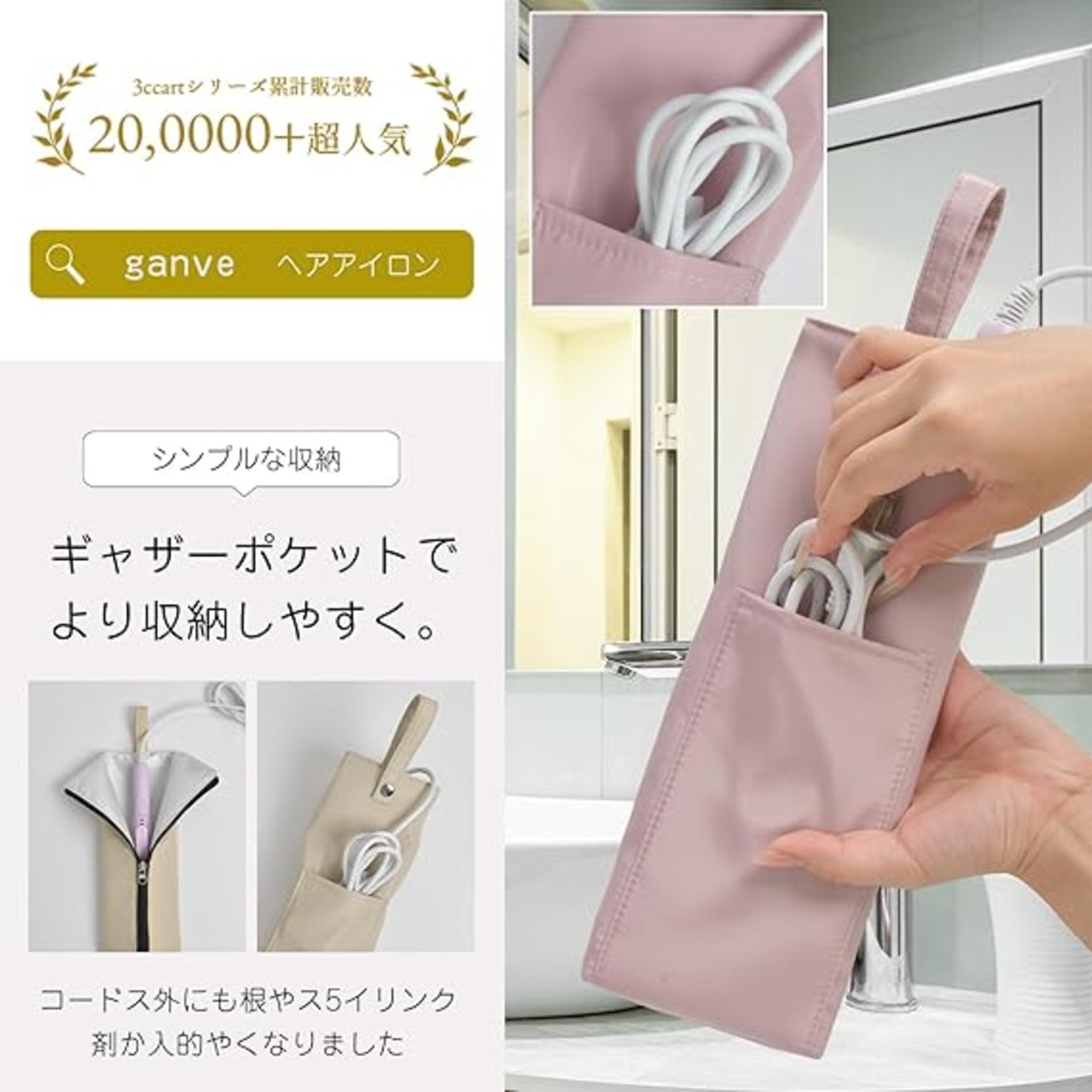 【吊るして収納可能】壁面のタオルハンガーや収納ラックに吊るしてご使用いただけます。ポーチ内でもアイロンホルダーのようにサッと取り出せます。洗面台に放置する心配もなく、ポーチで保管すればお子様が触れる心配もありません。