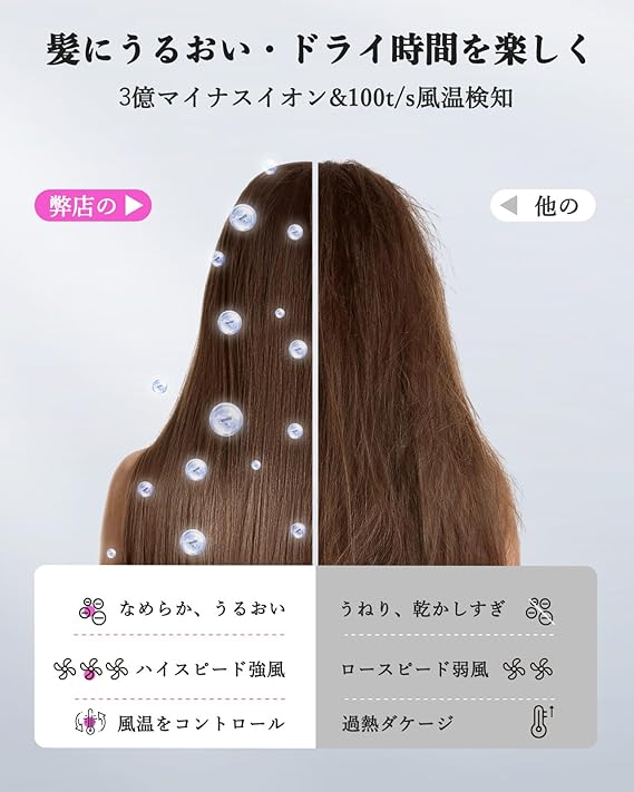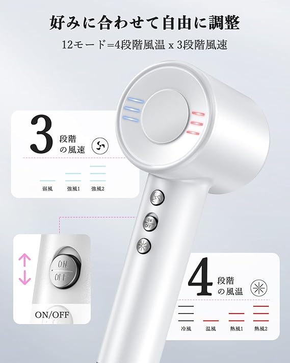 【12モード・温度検知】Bopwavyドライヤーは4段階風温+3段階風速でお好みに合わせて自由に調整します。さらに、毎秒100回温度を検知、NTCインテリジェント・ヒートコントロールによ