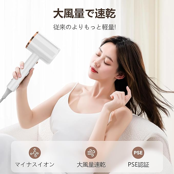 ドライヤー 大風量 マイナスイオン ヘアドライヤー 人気 ランキング 速乾 57℃恒温サロン級 過熱保護 3段階調整可能 コンパクト 超軽量 家庭用/出張用/旅行用 ノズル付き PSE認証済み (Milky White)