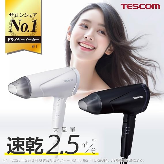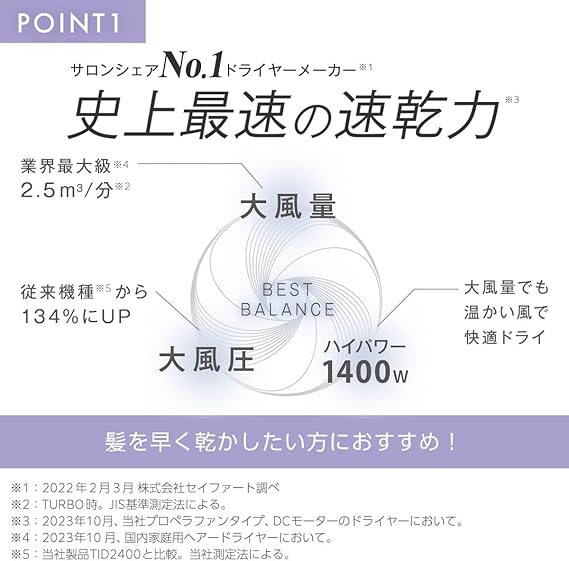 風量×風圧×ハイパワーのベストバランスによって、テスコム史上最速乾※2を実現しました。 大風量:業界最大級※3