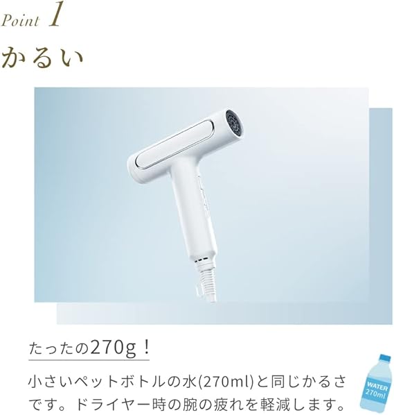 [片手で操作&持ち運びもラクラク!]ブロードライやスタイリング中に片手で操作するドライヤーだからこそ、本体の軽さにも こだわり。重さわずか約270g※は業界でもトップクラスの軽さ。※電源コード含まず
