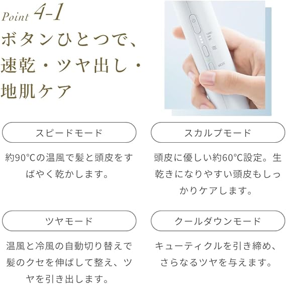 [モード切り替えはボタンひとつでOK ]傷みやすい濡れ髪をスピーディに乾かす「スピード」、低温で髪と頭皮をケアしながら乾 かす「スカルプ」、温冷風が自動でランダムに切り替わる「ツヤ」、