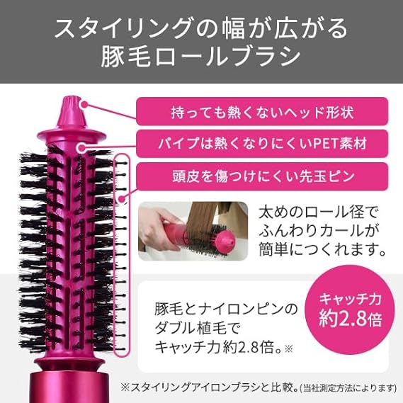 豚毛とナイロンピンのダブル植毛のブラシでキャッチ力約2.8倍※!径が太く、360度回転しながら豚毛が髪の毛をしっかりキャッチするので ふんわりとしたナチュラルなカールが簡単につくれます。※ スタイリングアイロンブラシと比較。(当社測定方法による