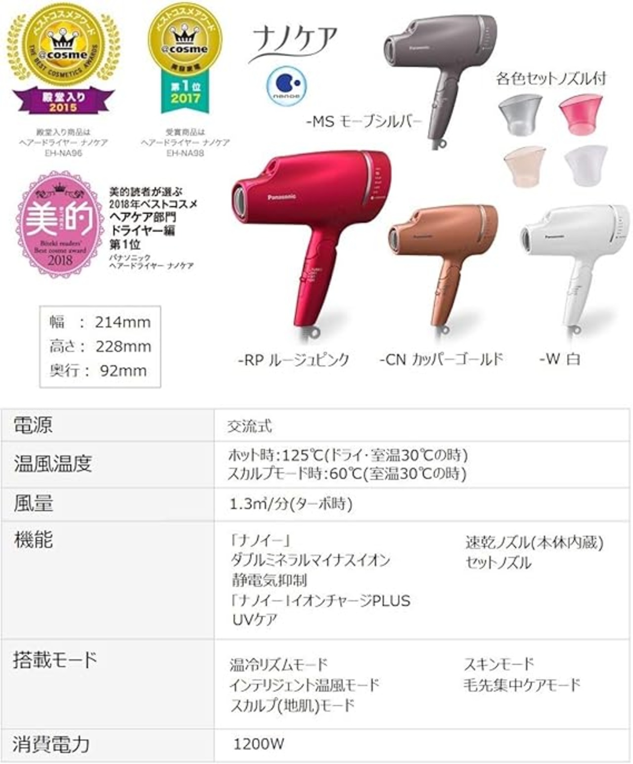 温風温度:125℃(ホット時/ドライ・室温30℃の時)、60℃(スカルプモード時/室温30℃の時)