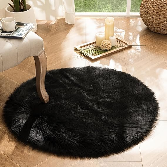 Ashler ラグマット カーペット 絨毯 毛足が長い 滑り止め付き 肌触りがいい ふわふわ 抗菌防ダニ おしゃれ 防音 冷房 床暖房対応 畳めて収納しやすい 洗える (円形 90×90cm ブラック)ブラック