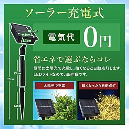 電気代0円!太陽光で充電して、暗くなると自動で点灯するソーラーLEDイルミネーションガーデンライトです。