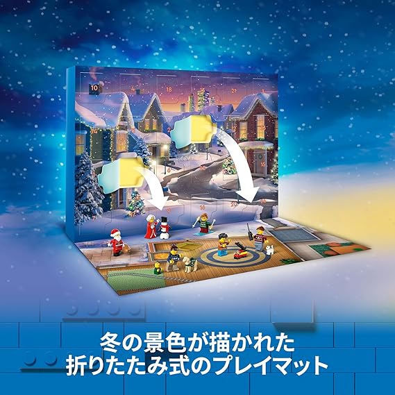 プレイマット付き – カレンダーの箱を広げると冬の町をイメージしたプレイマットになり、ミニフィギュアやミニモデルを使ったごっこ遊びの背景として役立ちます