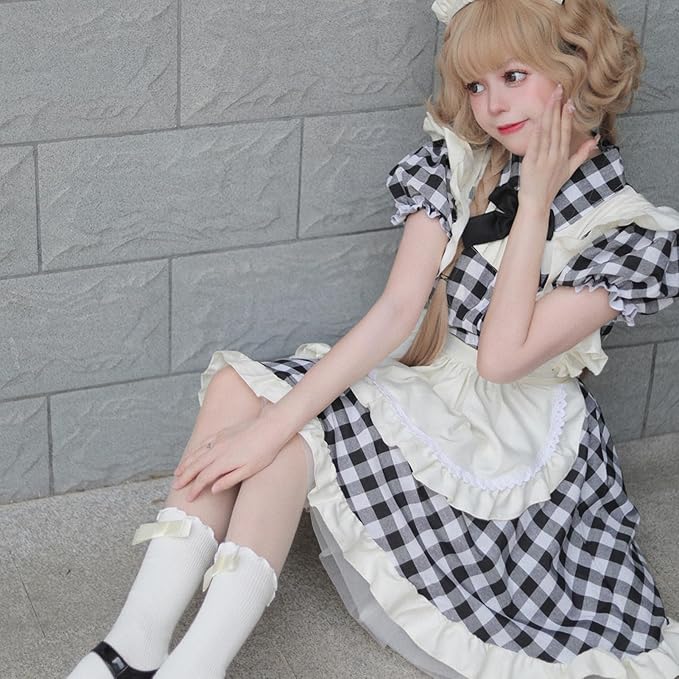 [HarnyLoom] メイド服 コスプレ 衣装 チェック柄 フリル ロリータ かわいい カチューシャ 付き 4点セット ハロウィン レディース 仮装 衣装 コスチューム 可愛い 大人用 メイド服