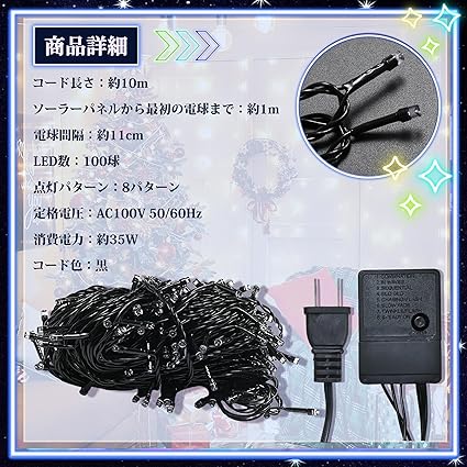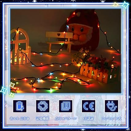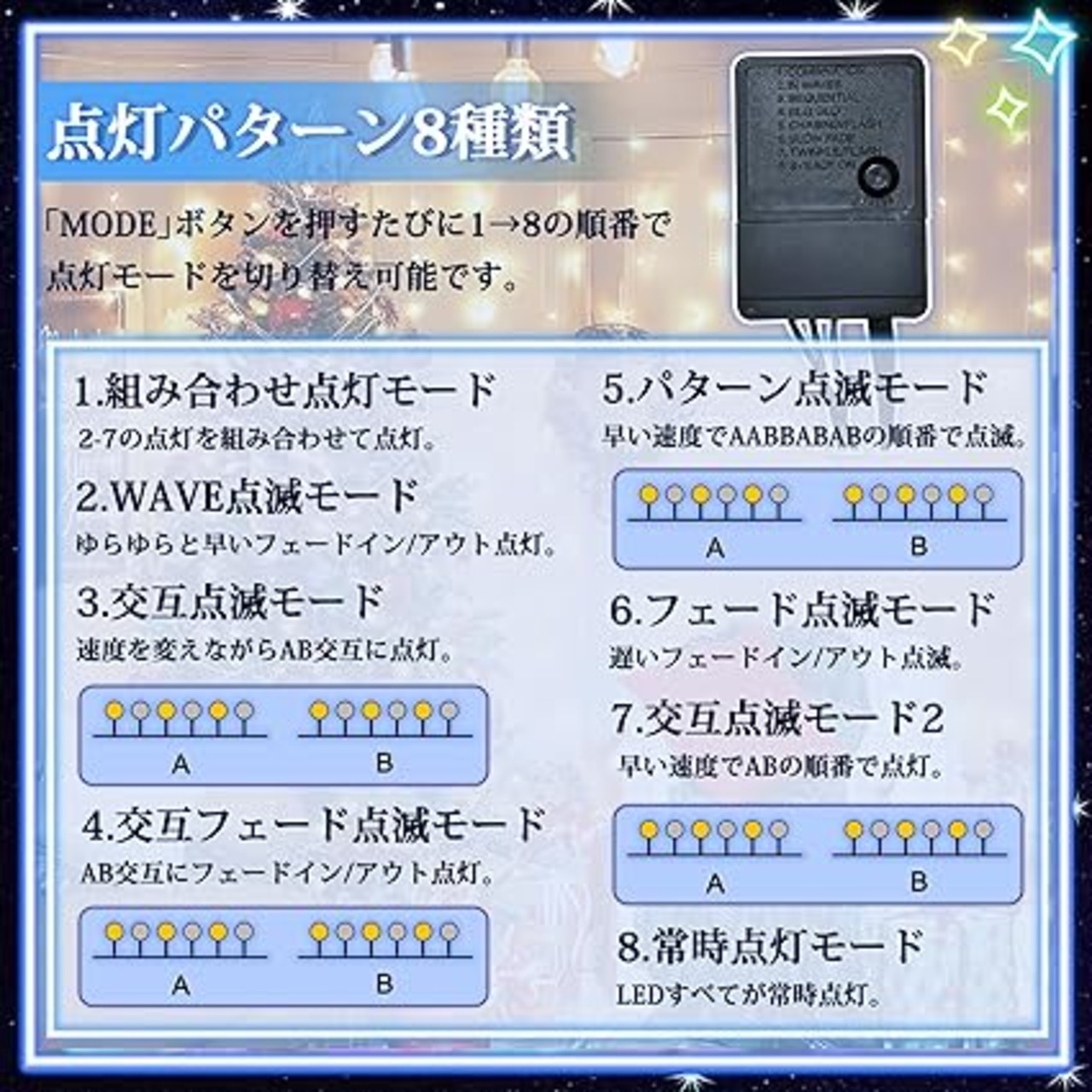 【多種類の点灯モード】他に雰囲気に合わせて常時点灯や点滅など全8つの点灯パターンを設定できるLEDフェアリーライトです。ACアダプターのボタンを押すことで、点灯モードを調節可能です。
