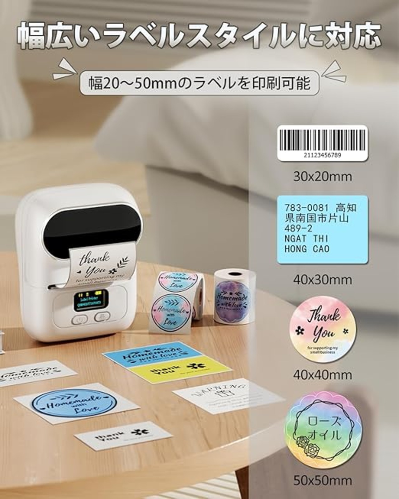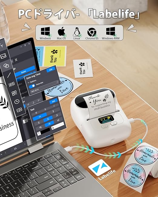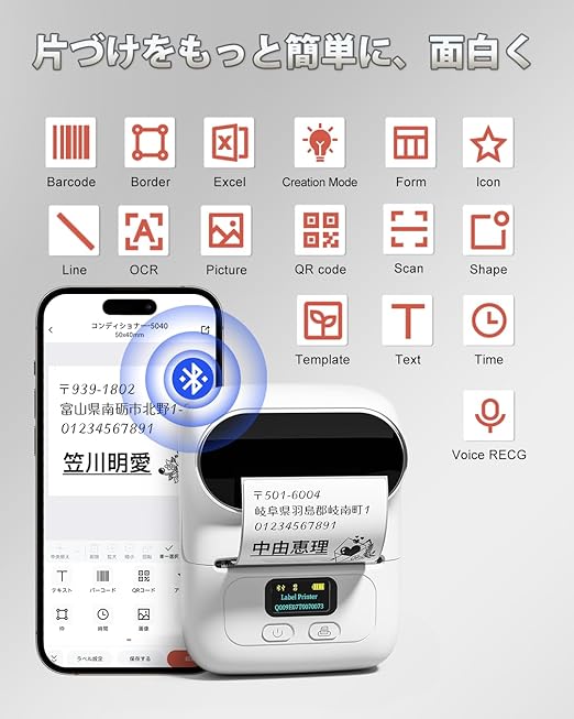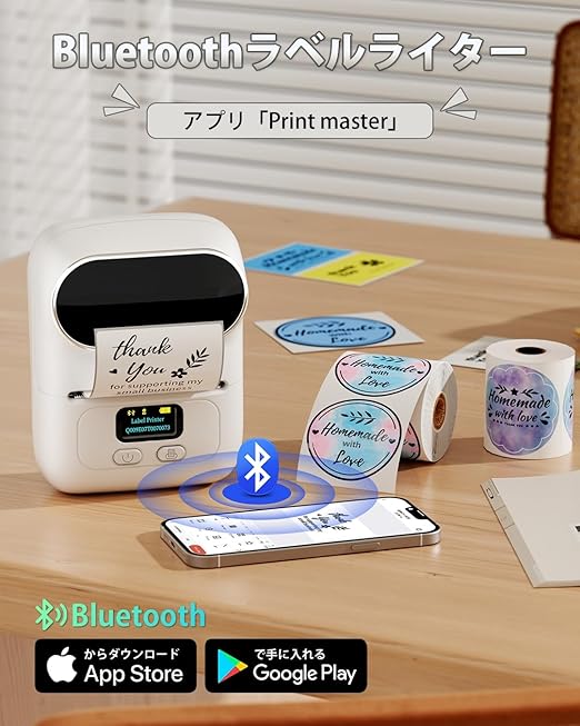 「何時何処でも手軽にシールを作れる」Android、Ios適応、Bluetooth接続、ネット無しにも使えます。充電式バッテリーが内蔵され、複数の接続端末切り替え可能のラベルプリンターです