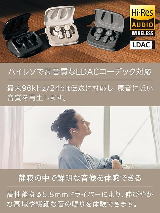 【発売記念デジタルギフトプレハイレゾワイヤレスで高音質&イコライザー搭載:ハイレゾワイヤレスで高音質が聴ける、LDACコーデックに対応。最大 96kHz/24bit 伝送に対応し、広帯域・高ダイナミックレンジを実現。原音に近い音質で再生することができます。また、LDAC以外のAAC/SBCコーデックにも対応しており、幅広い機種に対応しております。上位モデル『ATH-TWX9』の設計思想を継承したφ5.8mm ドライバーを採用。妥協のない音質とノイズキャンセリング効果の体感レベルを高めることにより
