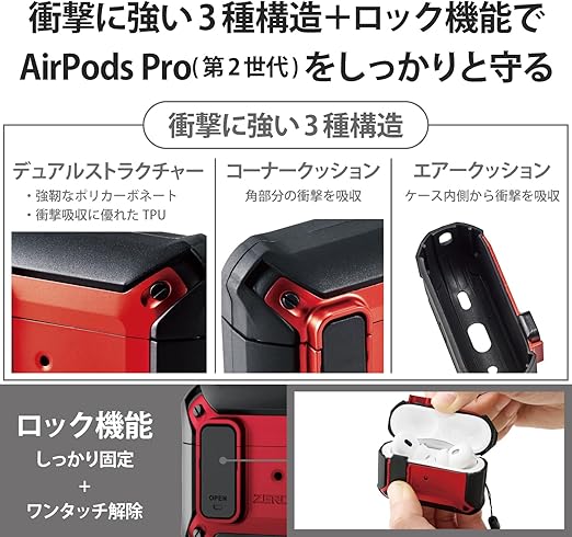エレコム AirPods Pro 2 第2世代 2022年 用 ケース 耐衝撃 衝撃吸収 カラビナ付き ZEROSHOCK Lockシリーズ エアークッション 二層構造 コーナークッション magsafe充電 ワイヤレス充電 対応 レッド AVA-AP4ZEROLRD