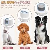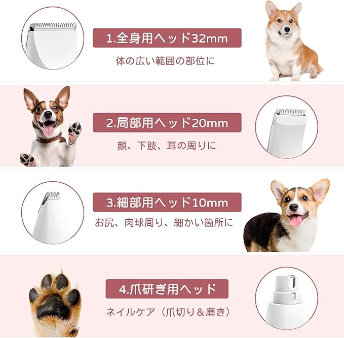 【1台多機能バリカン全身カット自由】犬用バリカンは交換可能な4つのカッターヘッドが付属していて、トリミングヘッド、局部用ヘッド、ミニヘッド、爪研ぎヘッド四つのヘッドから選べるので、犬や猫、ウサギなどの動物の顔から耳道周り・全身・足の爪の周りまでカットできます。電動バリカン 犬を掃除用のブラシもついているため、手間をかけずに清潔できます。