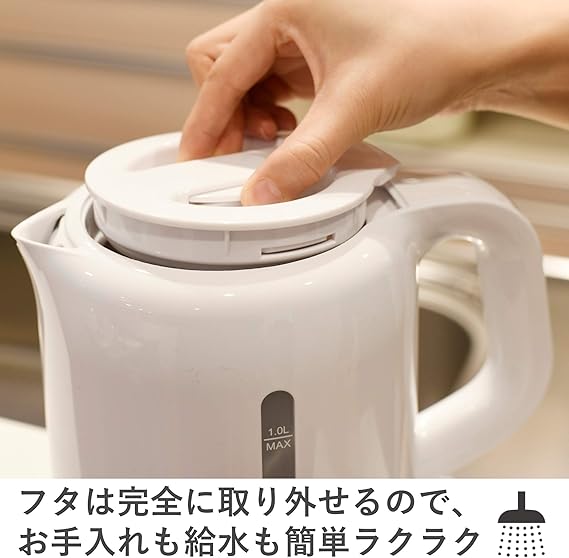 【1200Wハイパワー】1200Wのハイパワーで満水時でも約5分半でお湯が沸かせ、コーヒーや紅茶など、飲みたいと思ったときにすぐお湯を沸かしてくれます。容量も1Lと大容量なので、家族みんなでのティータイムなどにも役立ちます。※沸騰時間は目安で、条件(室温・水温等)によって異なります。